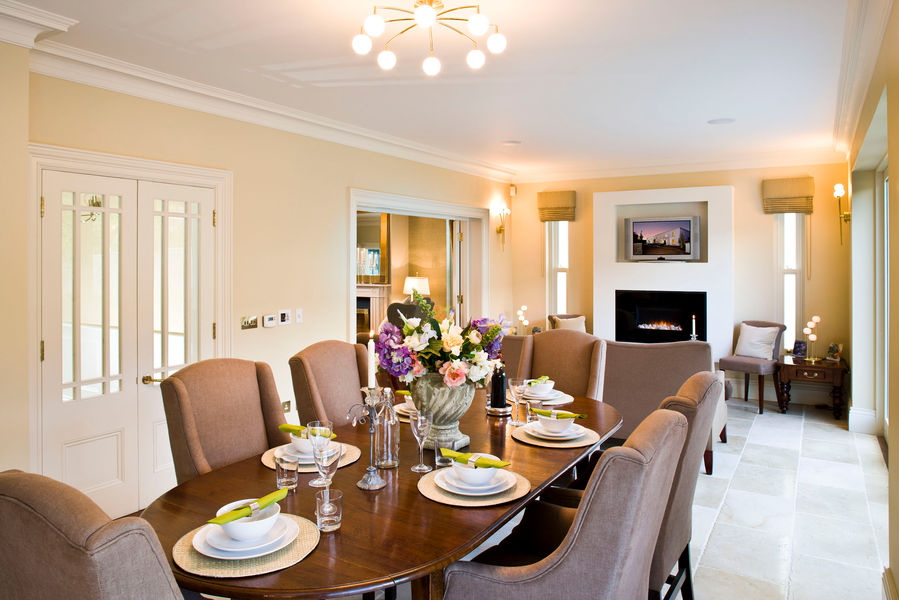These crisp homes get their luxurious qualities from their bespoke joinery including a grand oak staircase and timber wainscotting panelling throughout. The kitchen and the living area, equipped with a fireplace, are located to the back of the house and have attracted attention as a result of their floor to ceiling glazing which blurs the lines between inside and outside, inviting the landscaped patios into the home and vice versa.